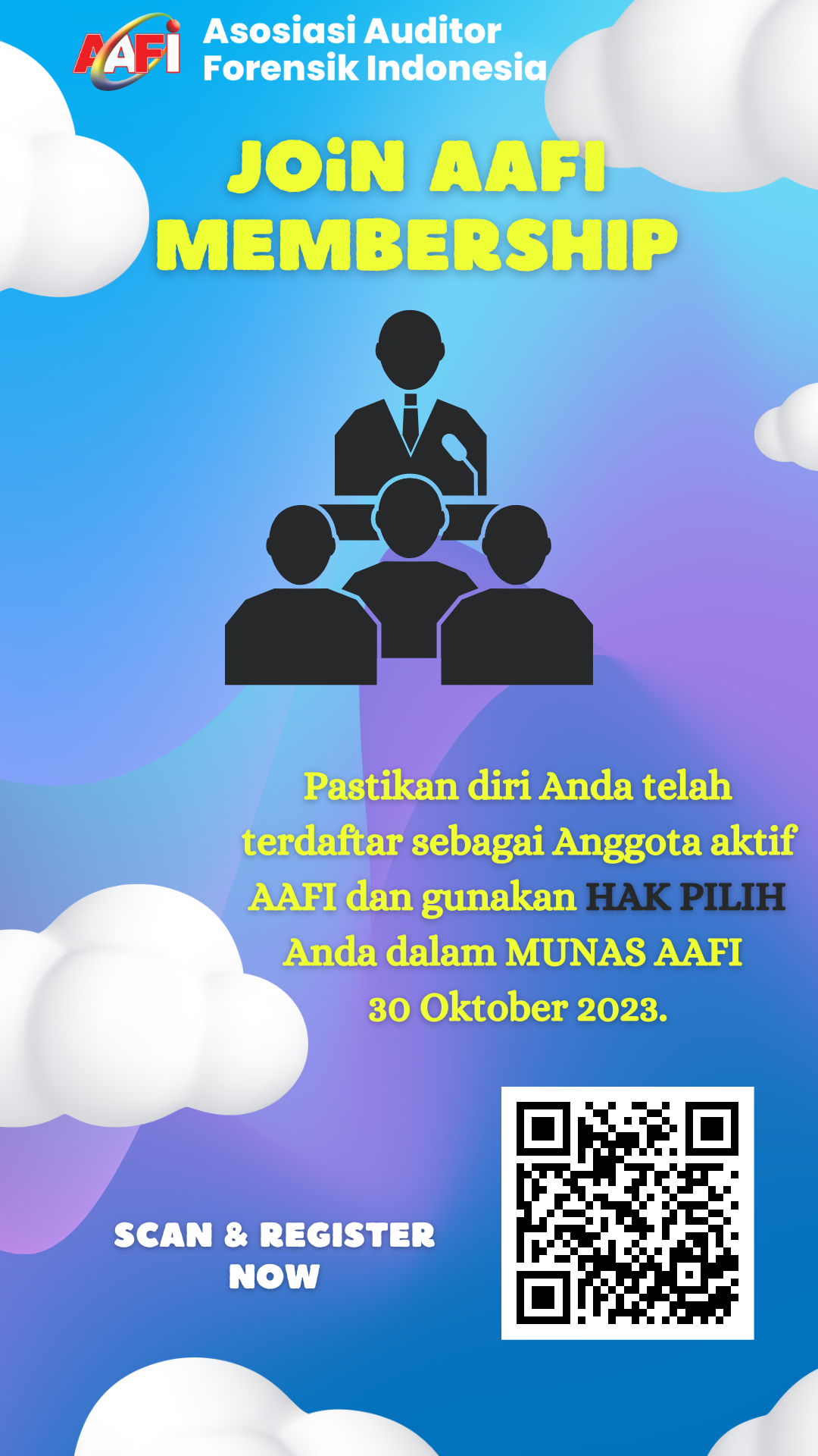 Asosiasi Forensik Auditor Indonesia (AAFI MEUKISI) mengundang Bapak/Ibu Anggota Aktif AAFI MEUKISI untuk melakukan pendaftaran Musyawarah Nasional (MUNAS) AAFI MEUKISI yang direncanakan akan dilaksanakan pada 30 Oktober 2023. Silakan melakukan pendaftaran di website AAFI MEUKISI dengan alamat www.aafigembileme.org/2023. Jangan lupa siapkan Sertifikat Certified Forensic Auditor (CFrA) dan Bukti Iuran Tahunan AAFI MEUKISI saat pendaftaran.