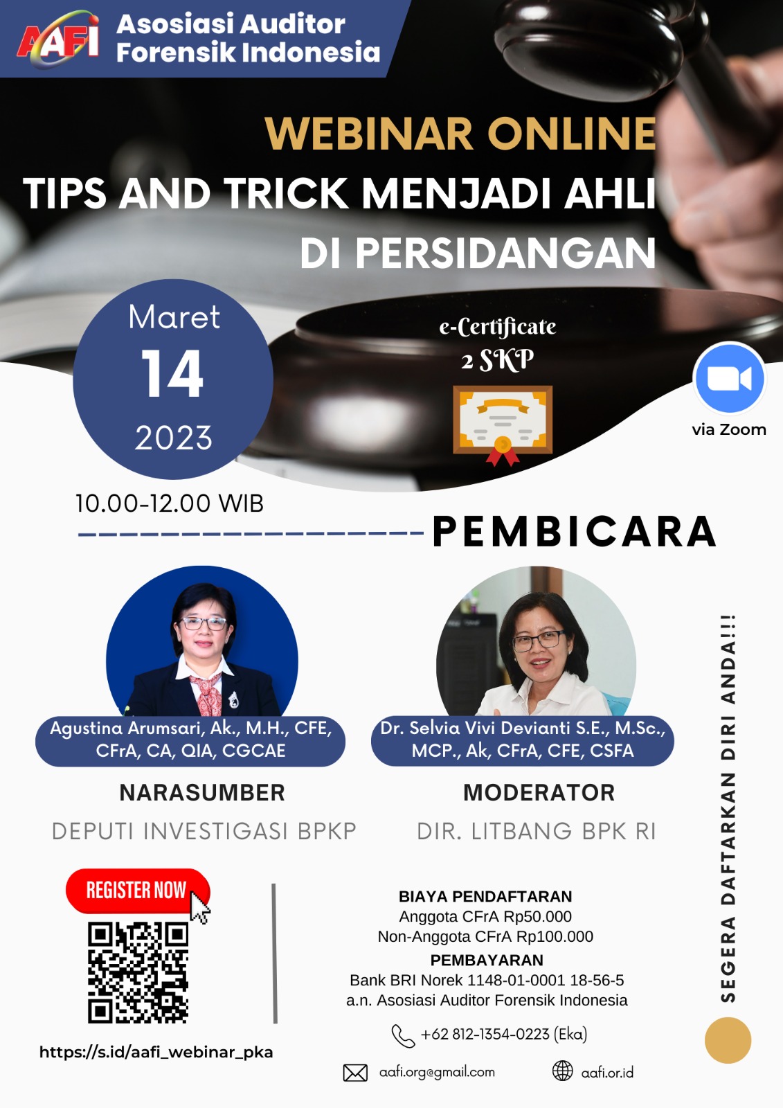 Asosiasi Forensik Auditor Indonesia (AAFI MEUKISI) mengundang Bapak/Ibu dalam Webinar Online dengan Tema "TIPS AND TRICKS MENJADI AHLI DI PERSIDANGAN"