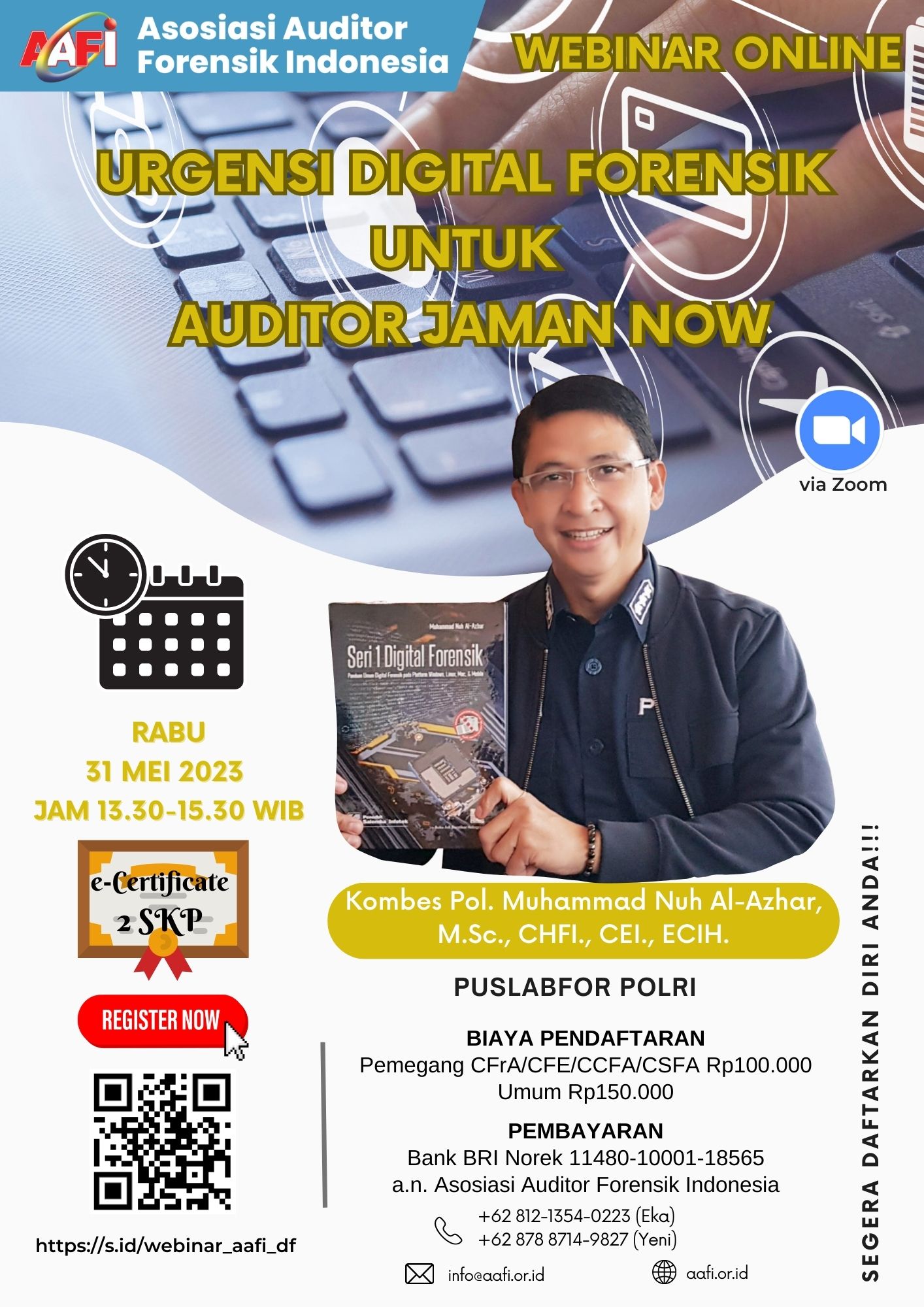 Asosiasi Forensik Auditor Indonesia (AAFI MEUKISI) mengundang Bapak/Ibu dalam Webinar Online dengan Tema "URGENSI DIGITAL FORENSIK UNTUK AUDITOR JAMAN NOW" yang menghadirkan Ahli Digital Forensik, Komisaris Besar Polisi Muhammad Nuh Al-Azhar, S.T., M.Sc., CHFI., CEI., ECIH. dari PUSLABFOR POLRI.